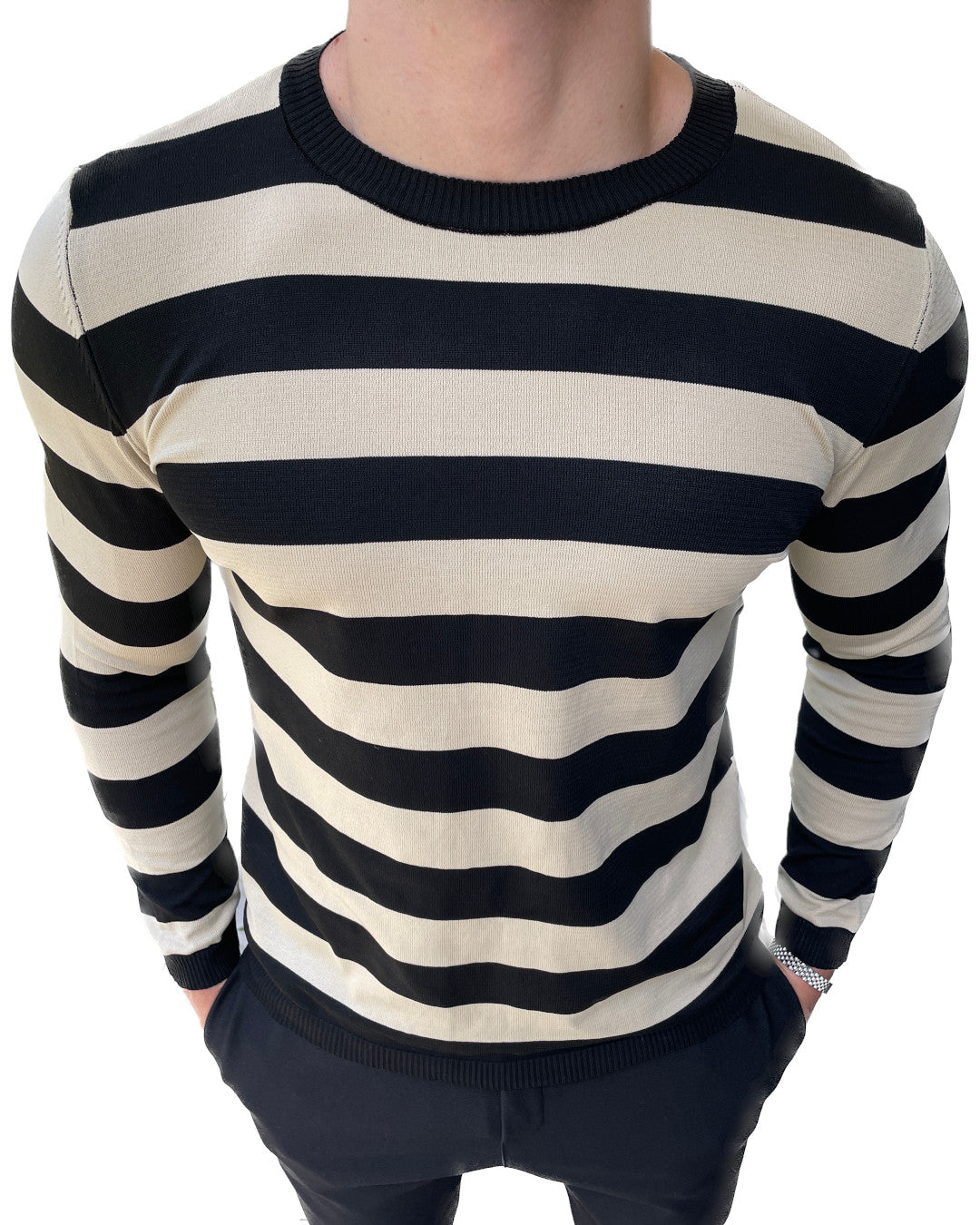 Slim Fit gestreiftes Langarmshirt - Schwarz/Creme