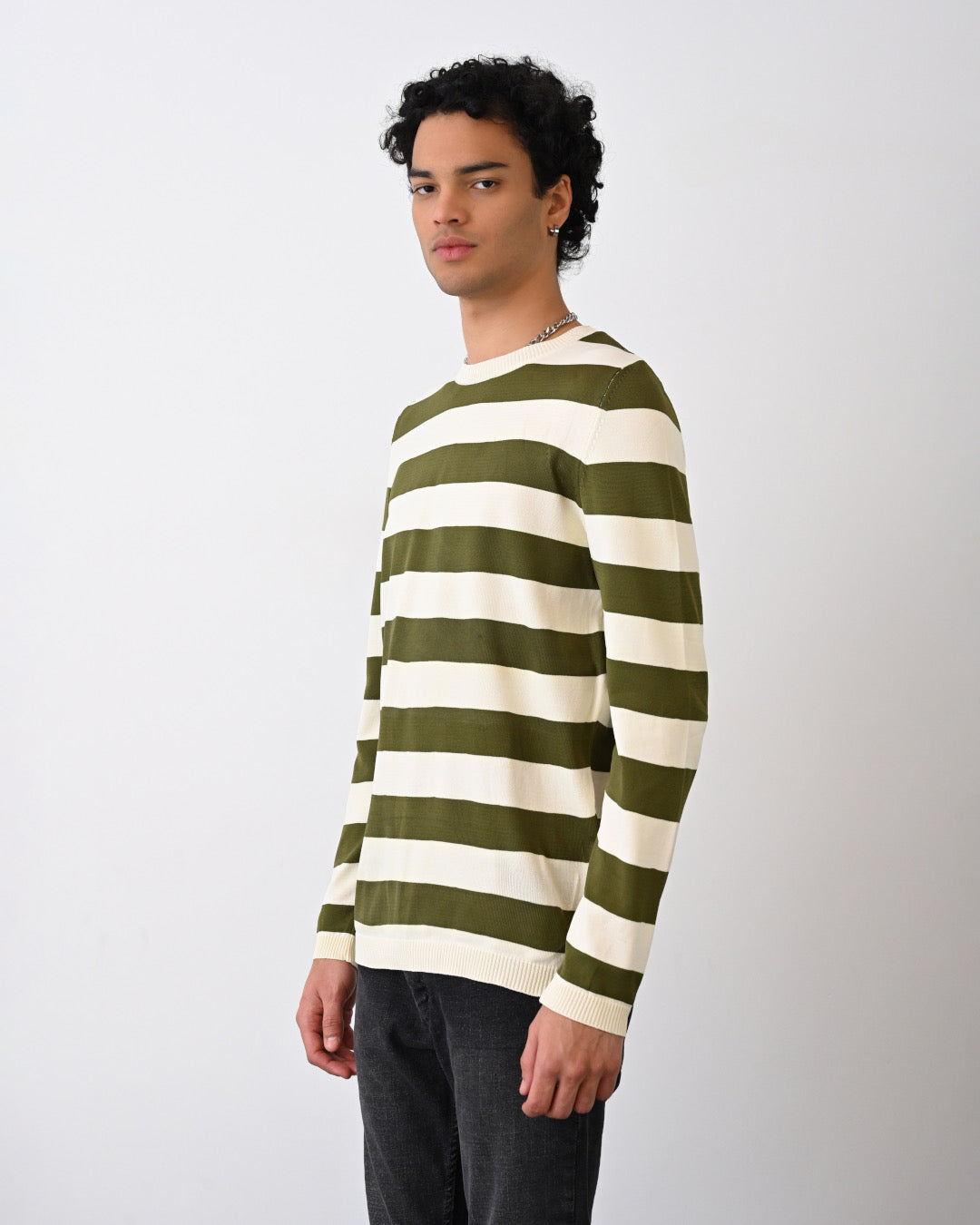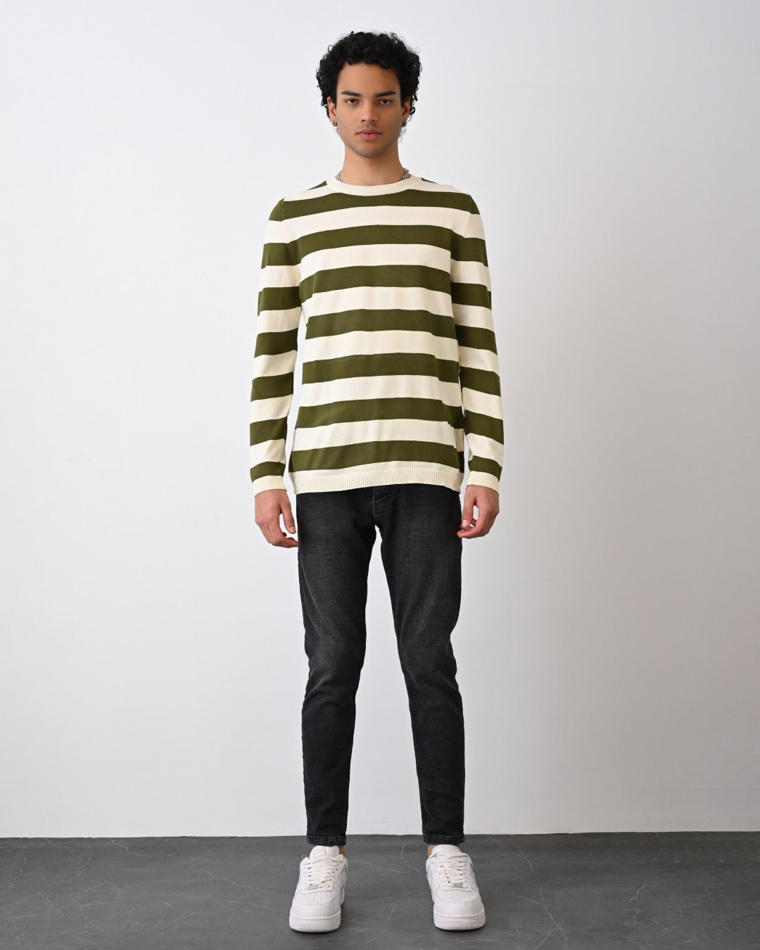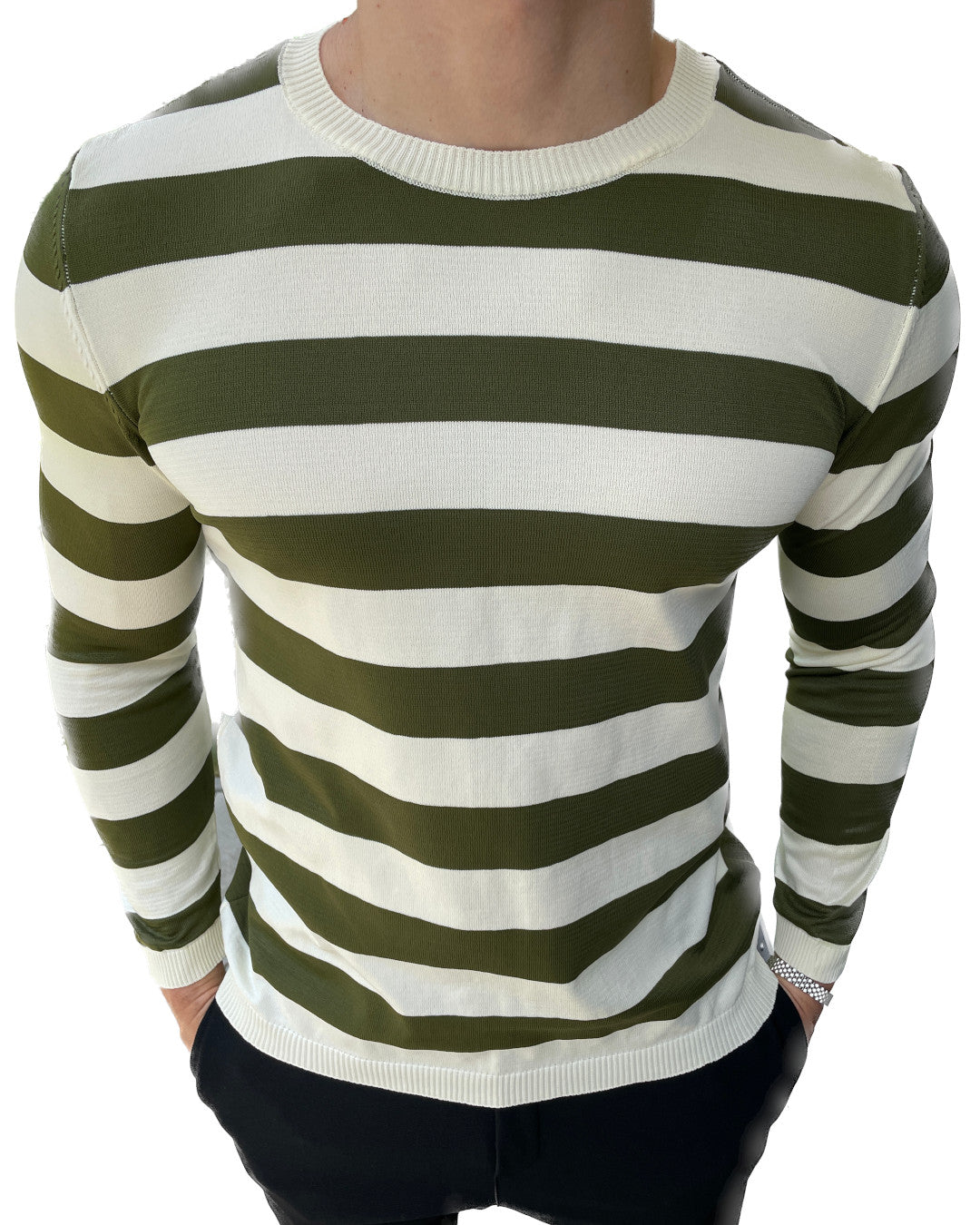 Slim Fit gestreiftes Langarmshirt - Khaki/Creme